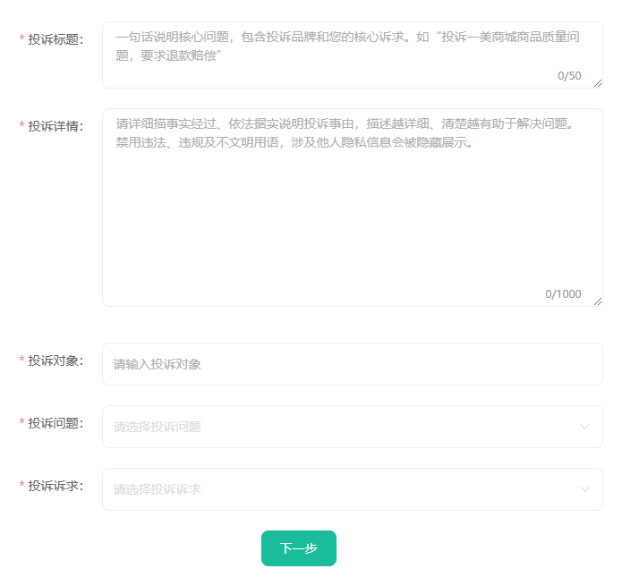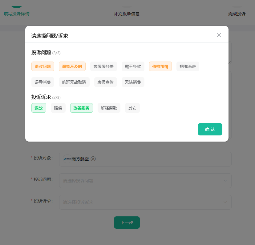 根据需要选择【投诉问题】以及【投诉诉求】,最多选择3个
