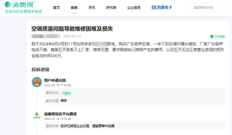 在消费保投诉平台以“家电维修”为关键词搜索,发现有数百条相关投诉。不少用户投诉“售后无人”“维修质量不佳”等问题。如果平台介入后商家还是各种推诿,对相关问题拒不承认或处理结果不能令您满意,消费者还可向消费保平台发起投诉。消费保作为中国电子商会旗下消费投诉平台,消费保已成功协调帮助数万名消费者解决相关消费投诉。
