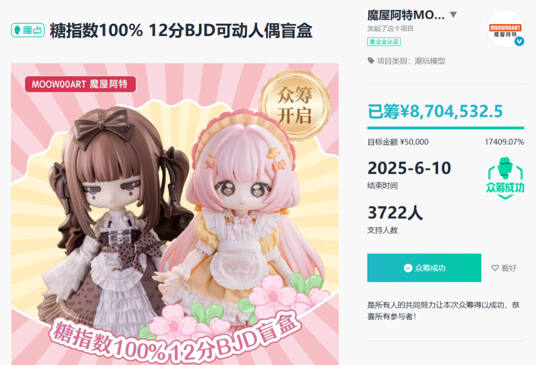 记者从摩点平台了解到,该众筹项目发起人为“魔屋阿特MOOWOOART”(品牌隶属于2024年11月注册成立的武汉魔屋阿特文化创意有限公司),3722人支持了该项目,于今年6月10日众筹成功,金额超870万元。