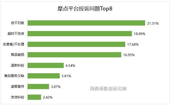 据消费保平台数据显示,涉及摩点投诉问题较为集中,其中“货不对版”的投诉占比最高,为21.31%,这也是“糖指数100%”众筹用户主要投诉的问题;紧随其后的分别是“超时不发货”(18.89%)、“态度差/不处理”(17.68%)、“商品破损”(16.95%),这几类问题累计占比超七成。
