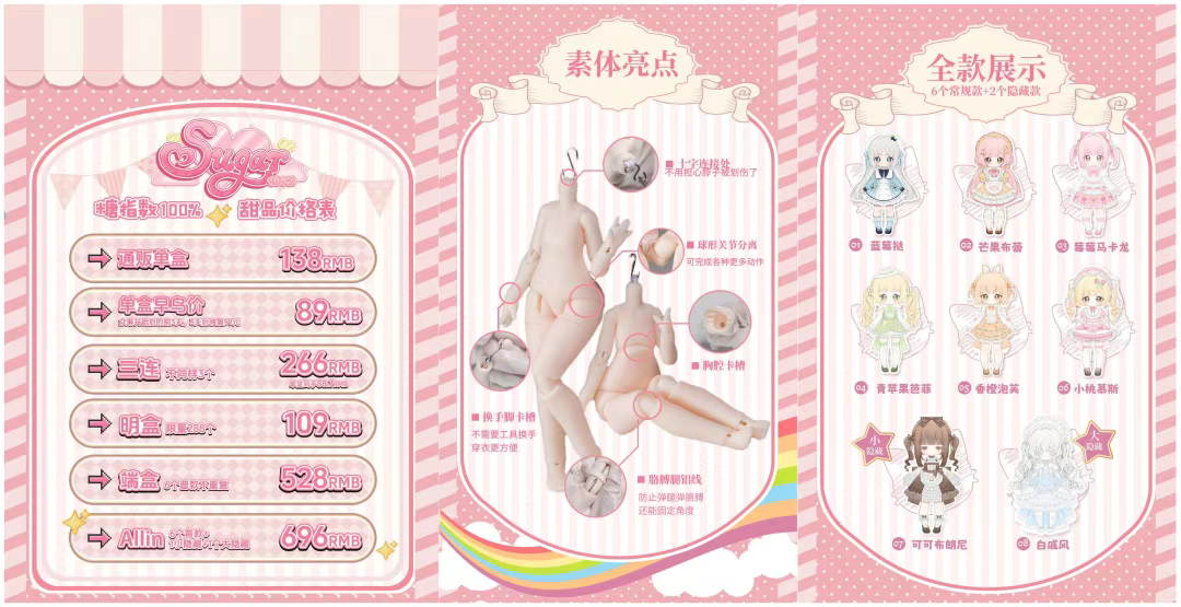 简单科普一下,BJD是“球形关节人偶”(Ball Jointed Doll)的缩写简称,通常由树脂或陶瓷制成,关节采用球形设计,可以灵活摆放各种姿势、搭配各种服装配饰与妆造。在摩点上看到,“糖指数100%”12分BJD可动人偶盲盒,通贩单盒价格138元,素体包括球形关节分离、胳膊腿铝线、换手脚卡槽等特点。