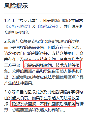 但作为平台方,摩点有义务保障交易环境的安全,向支持者披露众筹项目关键信息,并在发起方违约时协助支持者维权。