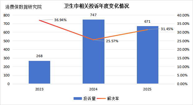 数据统计,2025年1月1日至10月28日,消费保投诉平台共收到卫生巾相关投诉671件,涉及金额59.40万元,投诉解决率为31.45%。近两年投诉量出现较大增长,但整体解决率偏低。