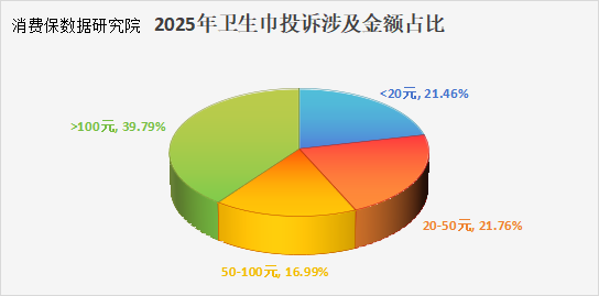 据统计,在卫生巾相关投诉中,39.79%的投诉金额集中在100元以上,其次是20-50元之间,占比21.76%,20元以下的占比为21.46%,涉及金额较小。