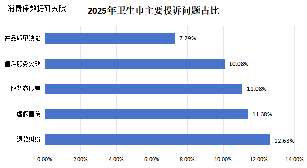 卫生巾的相关投诉主要集中在退款纠纷、虚假宣传和服务态度差等问题上,占比分别为12.63%、11.38%和11.08%。