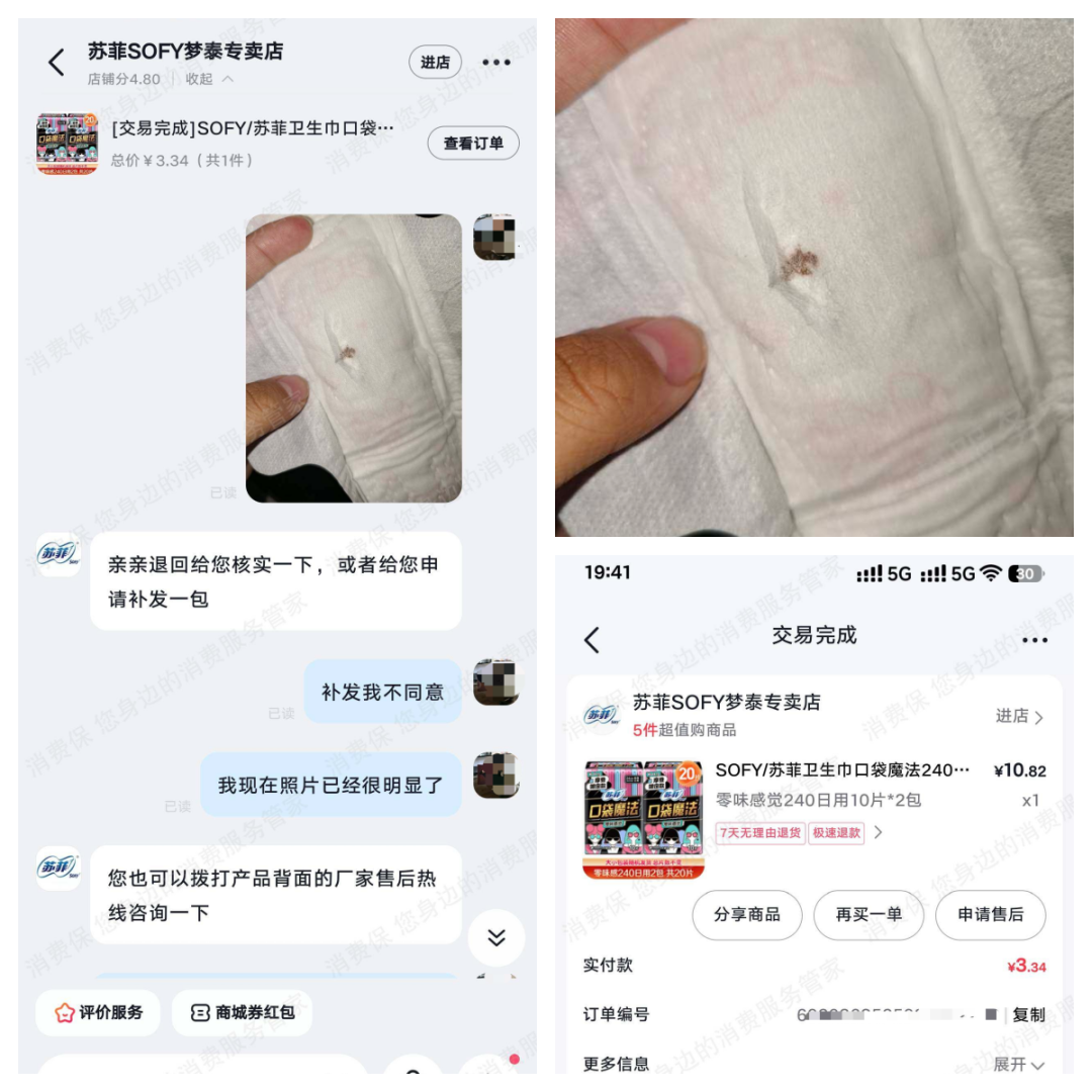 “我联系客服,也只是说不行可以退货,而不是说要改进包装。卫生巾的安全性被大家关注,商家为啥不改善包装呢?”