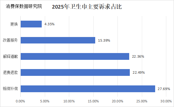 据消费保投诉平台数据,消费者对卫生巾的诉求主要涉及赔偿补偿、退费退款和解释道歉等;其中要求赔偿补偿的诉求占比居首位,达27.69%,退费退款(22.49%)、解释道歉(22.36%)、改善服务(15.39%)分别排在其后。