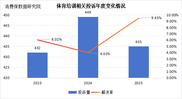 据统计,2025年1月1日至2025年11月10日,消费保平台共收到体育培训相关投诉435件,涉及金额308.31万元,投诉解决率低,仅为9.43%。单次投诉涉及金额较大,因“闭店潮”引发的退费纠纷问题尤为突出。