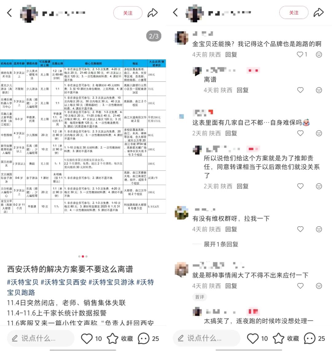 深圳和郑州闭店事件中,沃特宝贝均在官方微信号发布了课时兑换安排。但截至11月11日,沃特宝贝西安中心微信公众号仍未发布相关通知。