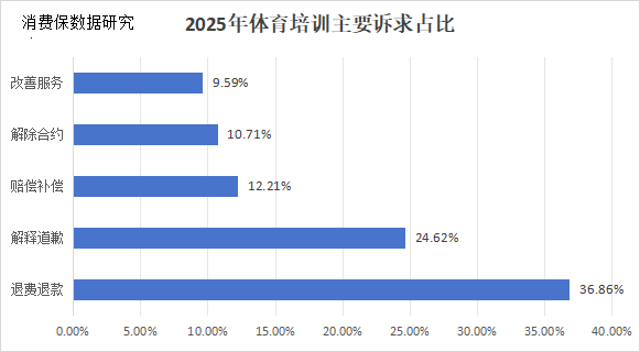 体育培训的投诉者诉求主要涉及退费退款、解释道歉和赔偿补偿等。其中,要求退费退款(36.86%)和要求解释道歉(24.62%)的占比超六成。反映出事件发生后,消费者对品牌的不信任。