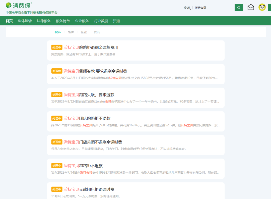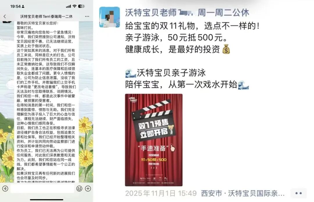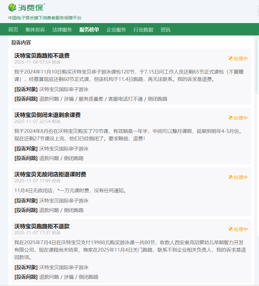 近日,消费保投诉平台收到来自西安消费者的大量投诉,称“沃特宝贝”西安门店全线关闭,相关负责人已联系不上,剩余课时款项无法退回。