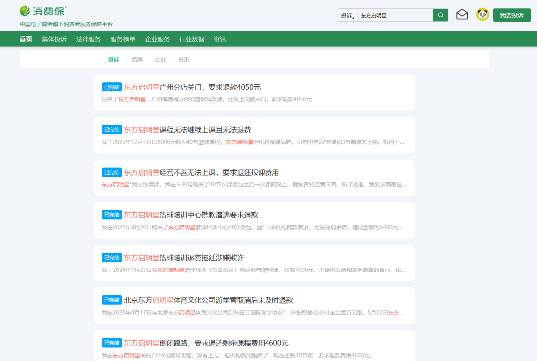 在众多体育培训机构中,2025年1月1日至2025年11月10日,东方启明星以115件投诉的数量位居第一,卓跃儿童体育馆和沃特宝贝国际亲子游泳紧随其后,分别为33件和21件。