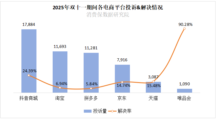 据统计,各电商平台投诉与解决情况差异显著:抖音商城投诉量最高,达17,884件,解决率为24.39%;淘宝网、拼多多投诉量分别为11,693件、11,281件,解决率依次为6.94%、5.84%;京东商城投诉量7,916件,解决率14.74%;天猫投诉量3,087件,解决率15.48%;唯品会投诉量虽最少(1,090件),但解决率高达90.28%,在头部平台中表现突出。