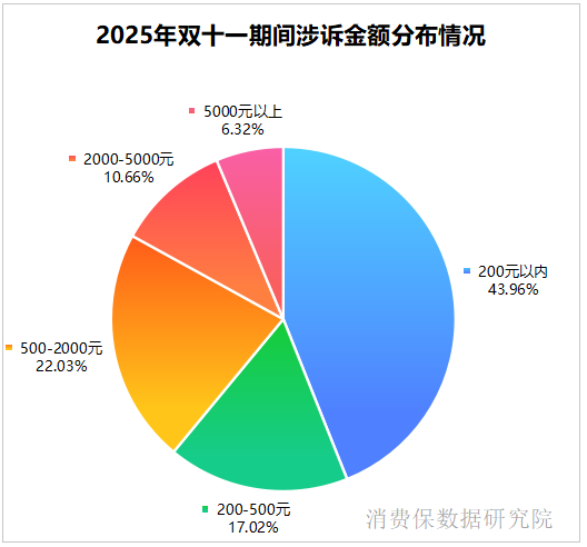 2025年双十一期间,电商涉诉金额分布呈现明显的小额集中特征。其中,200元以内的涉诉金额占比最高,达43.96%;500-2000元占比22.03%,200-500元占比17.02%;2000-5000元占比10.66%,5000元以上占比6.32%。可见,双十一期间电商涉诉以小额纠纷为主,同时也存在一定比例的中大额纠纷,反映出电商消费在覆盖低价日常品的同时,也涉及中高端商品的交易争议。