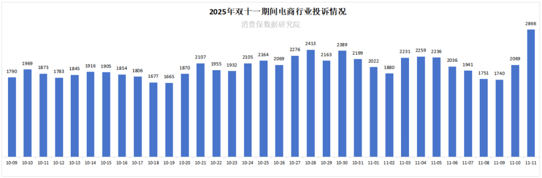 电商服务市场规模持续扩大,行业竞争与消费活力同步提升。在2025年双十一期间(10月9日-11月11日),消费保平台电商相关投诉呈现明显的时间分布特征:整体投诉量随大促节点波动,11月11日当天投诉量达峰值2866件,全周期累计投诉68,756件;累计涉诉金额超1.09亿元,有效投诉解决率仅为11.99%。可见,电商大促期间的消费纠纷随交易热度集中爆发,需行业针对性优化服务保障机制。