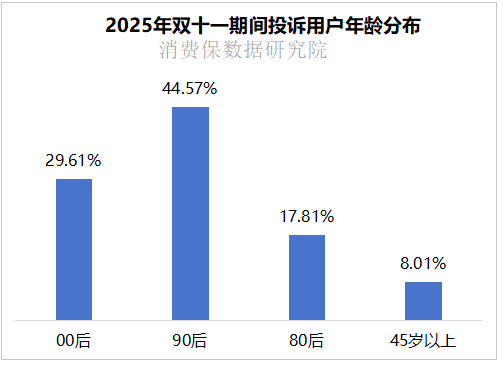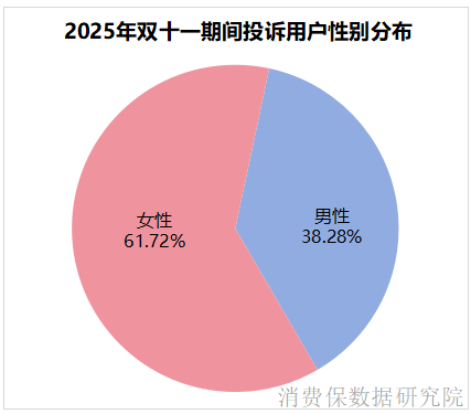 2025年双十一期间,电商投诉用户的性别与年龄分布特征明显。性别方面,女性投诉占比61.72%,男性占比38.28%;年龄方面,90后以44.57%的占比成为投诉主力,00后占比29.61%,80后占比17.81%,45岁以上占比8.01%。整体来看,年轻群体尤其是90后、00后女性,是双十一电商投诉的主要参与群体,这与该群体的电商消费活跃度及对消费权益的关注度较高直接相关。