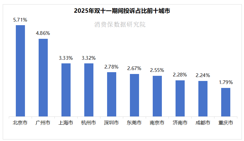 据统计,双十一期间电商投诉的城市分布呈现出明显的头部集中性,其中,北京市以5.71%的投诉占比位居首位,广州市占比4.86%位列第二;上海市(3.33%)、杭州市(3.32%)占比紧随其后。这与城市的消费活力、电商渗透率及人口规模高度关联,一线城市和电商产业发达城市的投诉集中度更为突出。