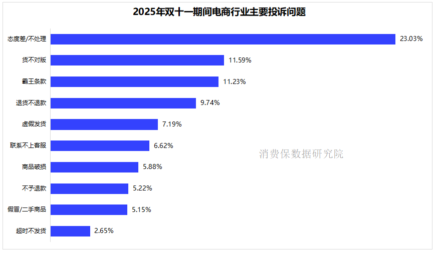 2025年双十一期间,电商投诉问题呈现显著集中性特征。态度差/不处理以23.03%的占比位居首位,货不对板(11.59%)、霸王条款(11.23%)紧随其后,反映出大促期间电商在客服响应效率、商品品控管理、规则条款合理性等环节面临突出压力。具体来看,服务类问题(态度差/不处理、联系不上客服)、商品类问题(货不对板、商品破损、假冒/二手商品)、交易类问题(霸王条款、退货不退款、不予退款)构成投诉核心维度,各平台需针对这些高频痛点,从服务体系、品控流程、交易规则等层面优化升级,以提升大促期间的消费体验。