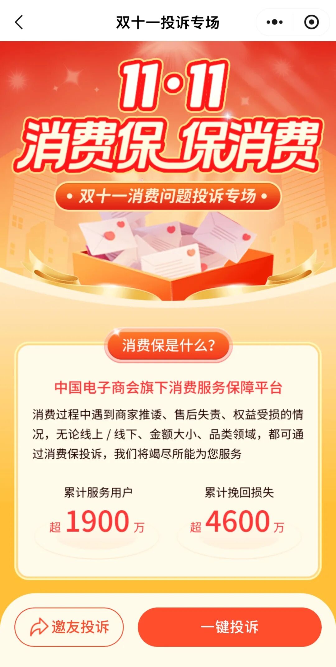 📢双十一维权专属通道已开启!如遇商家擅自取消订单、优惠券无法使用、虚假发货、拒绝价保等问题,无需容忍!第一时间上消费保发起投诉,为您的合法权益保驾护航。点击这里,立即投诉!