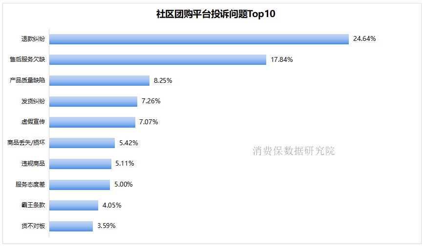 社区团购平台投诉问题的核心矛盾集中在交易与服务相关维度:退款纠纷以24.64%的占比位居榜首,是消费者反馈最集中的痛点;售后服务欠缺(17.84%)紧随其后;此外,产品质量缺陷(8.25%)、发货纠纷(7.26%)的占比也相对突出,整体反映出交易履约与服务保障能力不足是投诉高发的主要诱因。