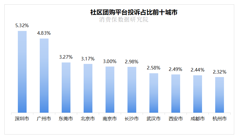 社区团购平台投诉用户的地域分布中,深圳市以5.32%的占比位居首位,广州市(4.83%)紧随其后,东莞市(3.27%)、北京市(3.17%)分别位列第三、第四。从城市分布来看,投诉占比靠前的城市多集中在珠三角地区(深圳、广州、东莞),反映出社区团购在人口密集的珠三角区域渗透度较高,对应的消费纠纷也相对集中。