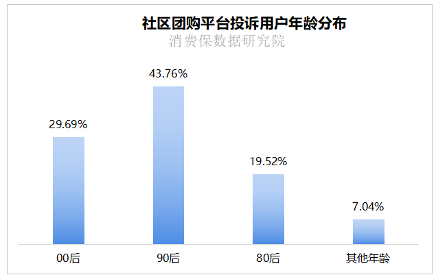 在社区团购平台投诉用户中,女性占比66.10%,男性占比33.90%。从年龄结构看,90后是投诉的核心群体,占比达43.76%;其次是00后,占比29.69%;这两个年轻群体合计占比超七成。整体呈现“年轻群体为主、女性用户更集中”的特征,与社区团购的主流消费人群画像基本一致。