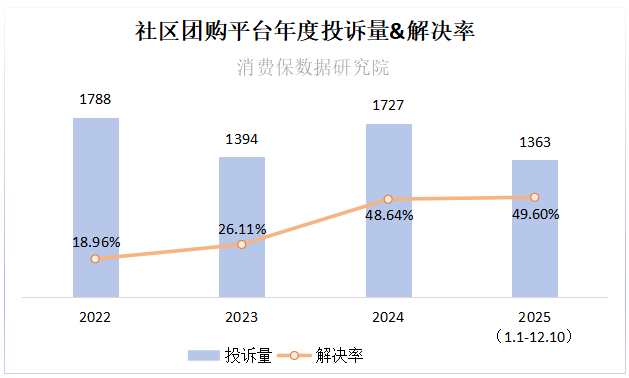 根据消费保平台社区团购平台投诉分析报告,2022年1月1日至2025年12月15日,消费保平台累计受理社区团购平台相关投诉共6272件,涉诉总金额达459.77万元,有效投诉的实际解决率为35.38%。这一周期内,2022年投诉量居首(1788件),后续投诉量虽有波动,但平台解决率呈现逐年上升的趋势。