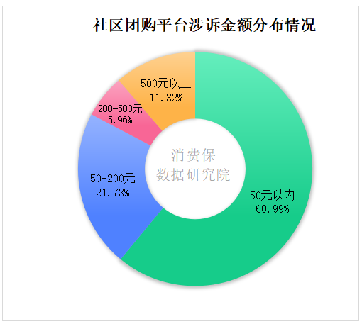 从社区团购平台涉诉金额分布情况来看,50元以内是涉诉金额最集中的部分,占比高达60.99%,整体呈现“小额为主、大额占比少”的特征,契合社区团购高频小额的消费属性。