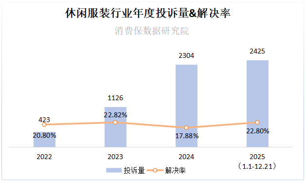 2022年1月1日至2025年12月21日,消费保平台累计受理休闲服装行业相关投诉共6278件,涉诉总金额达433.28万元,有效投诉的实际解决率为20.87%。行业投诉量呈逐年攀升的趋势,而解决率则处于波动徘徊状态,整体围绕20%上下浮动,行业投诉处理效率尚未形成稳定向好的态势。