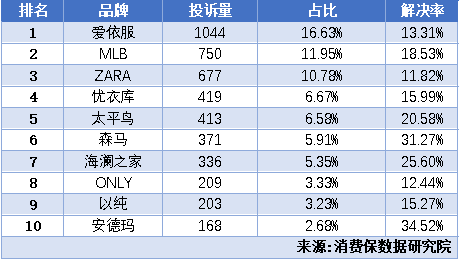 休闲服装行业相关投诉中,爱依服以1044件投诉量位居榜首,投诉解决率为13.31%;MLB以750件投诉排在第二,投诉解决率为18.53%;ZARA以677件投诉位列第三位,投诉解决率为11.82%。