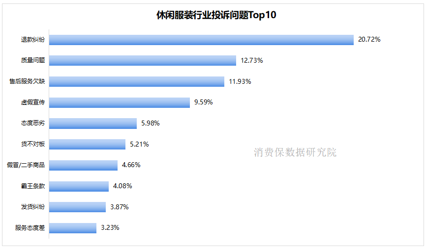 休闲服装行业投诉问题中,退款纠纷以20.72%的占比位居榜首,是消费者反馈最集中的痛点;质量问题(12.73%)、售后服务欠缺(11.93%)紧随其后,三者合计占比超四成。整体反映出交易履约、服务品质与产品质量的短板,是行业投诉高发的主要诱因。
