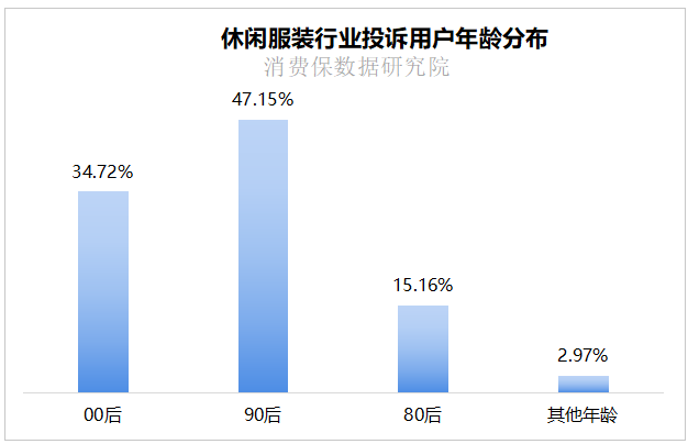 在休闲服装行业投诉用户中,女性占比高达79.36%,是投诉的绝对主力群体。从年龄结构看,90后是投诉的核心群体,占比达47.15%,其次是00后,占比34.72%,两者合计占比超八成。整体呈现“年轻群体为主、女性用户高度集中”的特征,契合休闲服装领域年轻女性为核心消费群体的行业画像。