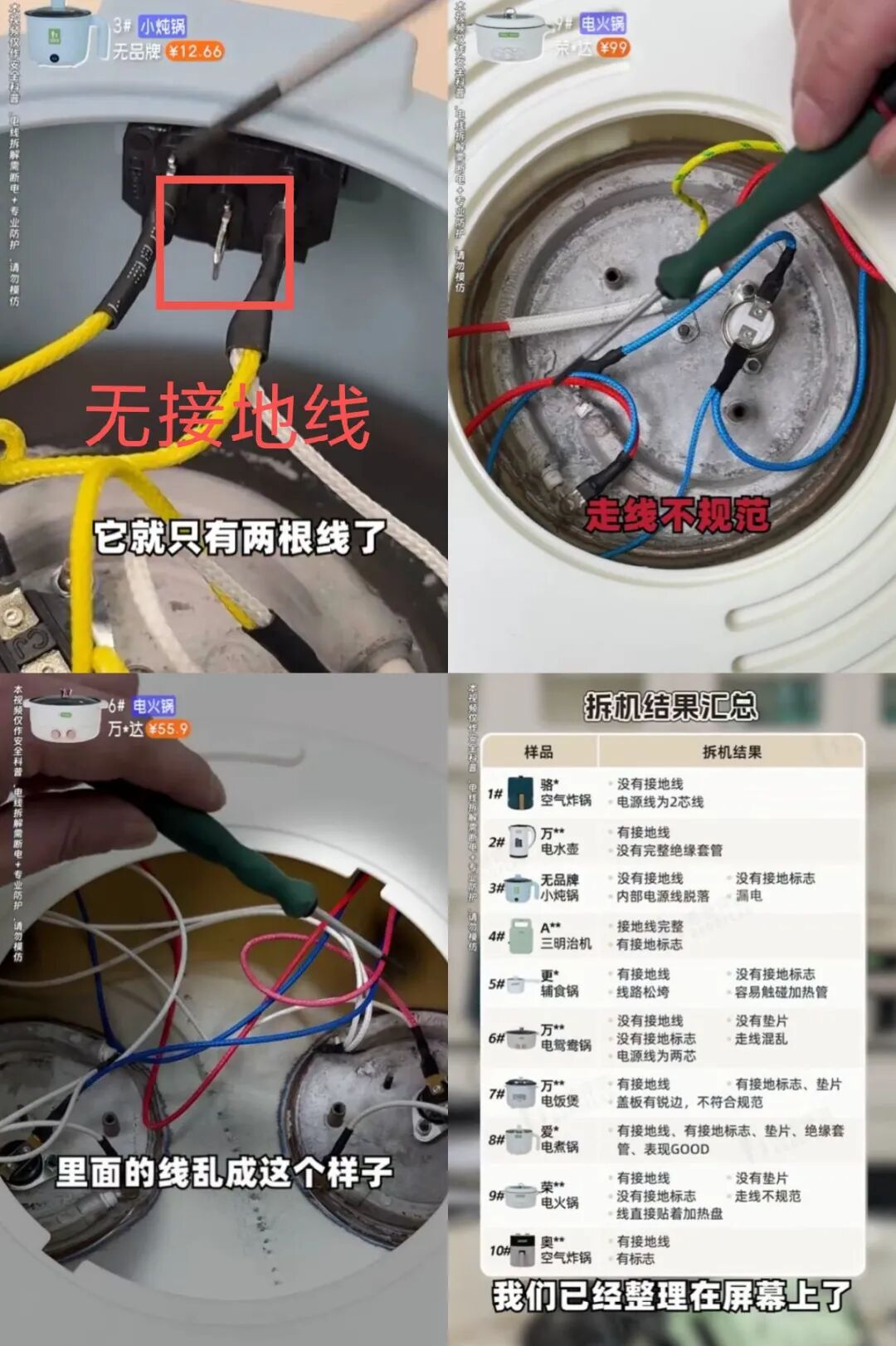测评结果显示,多款产品线路都存在问题,例如无接地线、线路紧贴加热盘、走线不规范等,有极大安全隐患。