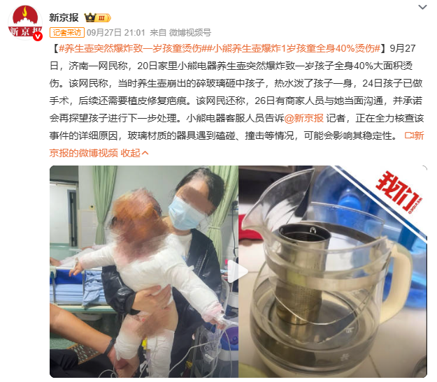 报道显示,9月20日,济南一名网友家中的小熊电器玻璃养生壶突然爆炸,导致1岁孩子全身40%面积遭受Ⅱ度至Ⅲ度烫伤。