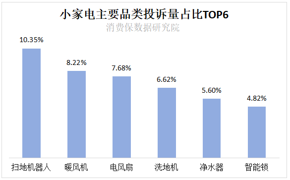 报告显示,小家电相关投诉中,扫地机器人以10.35%的占比排名第一。地面清洁类的扫地机器人、洗地机合计占比达16.97%,是投诉相对集中的品类之一。