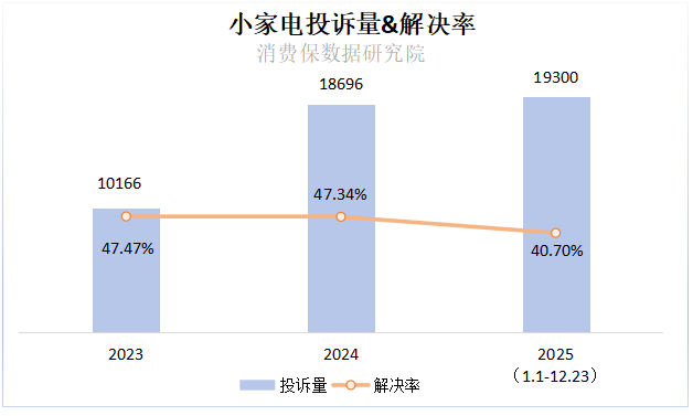 2023年至2025年12月23日期间,消费保平台累计受理小家电相关投诉共48162件,涉诉总金额达7324.09万元,有效投诉的实际解决率为44.71%。整体呈现“投诉量持续增长、解决率逐步下滑”的趋势。