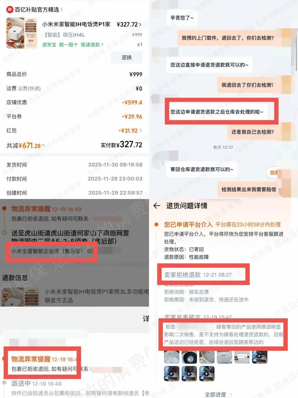 12月22日,消费者李女士(化名)在消费保平台发布投诉称,其在淘宝百亿补贴购买的小米米家智能微压IH电饭煲第一次使用就着火。