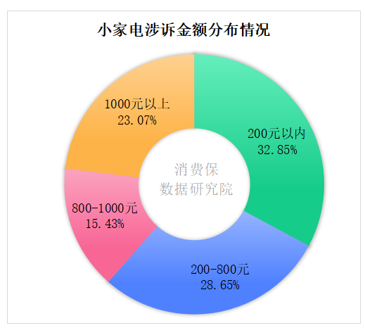 从小家电涉诉金额分布来看,200元以内的涉诉金额占比最高,达32.85%;200-800元区间占比为28.65%,二者合计占比超六成,是涉诉金额的核心区间。整体反映出小家电投诉以中低单价商品的小额纠纷为主。