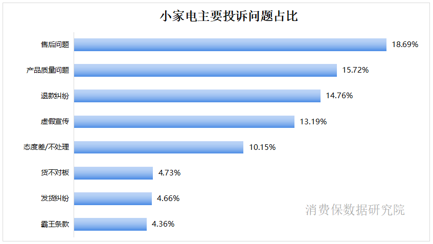 小家电主要投诉问题中,售后问题以18.69%的占比位居首位,是消费者反馈最集中的问题;产品质量问题(15.72%)紧随其后,二者合计占比超三成,构成投诉核心痛点。整体来看,售后履约、产品品质、交易纠纷是小家电投诉高发的主要诱因。