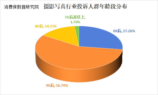 从投诉用户的性别分布情况看,女性为摄影写真的主要投诉群体,占比达86.95%,男性占比为13.05%,主要年龄层为90后,占比为56.79%,其次是00后,占比为27.26%。