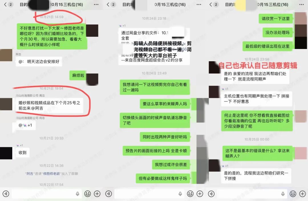 想着来都来了,张女士咽下一肚子的疑问开始拍摄。拍摄流程非常顺利,很快张女士和丈夫就完成了拍摄准备返程。10月15日,张女士特别叮嘱对方,说明自己婚期比较急:11月30日举行婚礼,需要在此之前拿到产品。