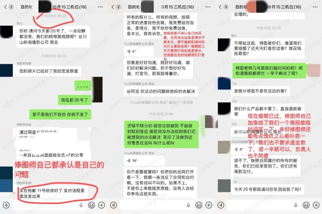 11月20日,眼看着婚期越来越近,对方却还没有联系张女士,这对夫妻有些担心,赶紧在群中艾特旅拍店负责人。很快,修图师发送了一条网盘链接,表示照片早在11月11日就已经修好,是自己工作疏忽,忘记将其发送到群聊中。对此,张女士感到很无语。