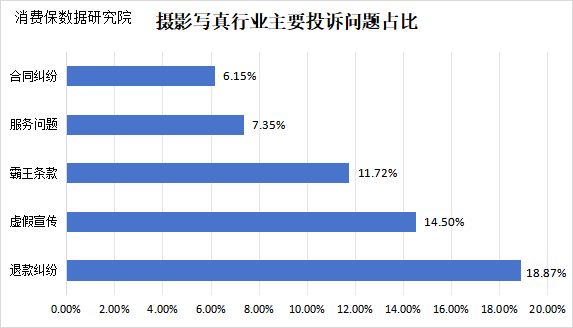 据消费保数据统计显示,摄影写真的相关投诉主要集中在退款纠纷、虚假宣传及霸王条款等问题上,占比分别为18.87%、14.50%和11.72%。