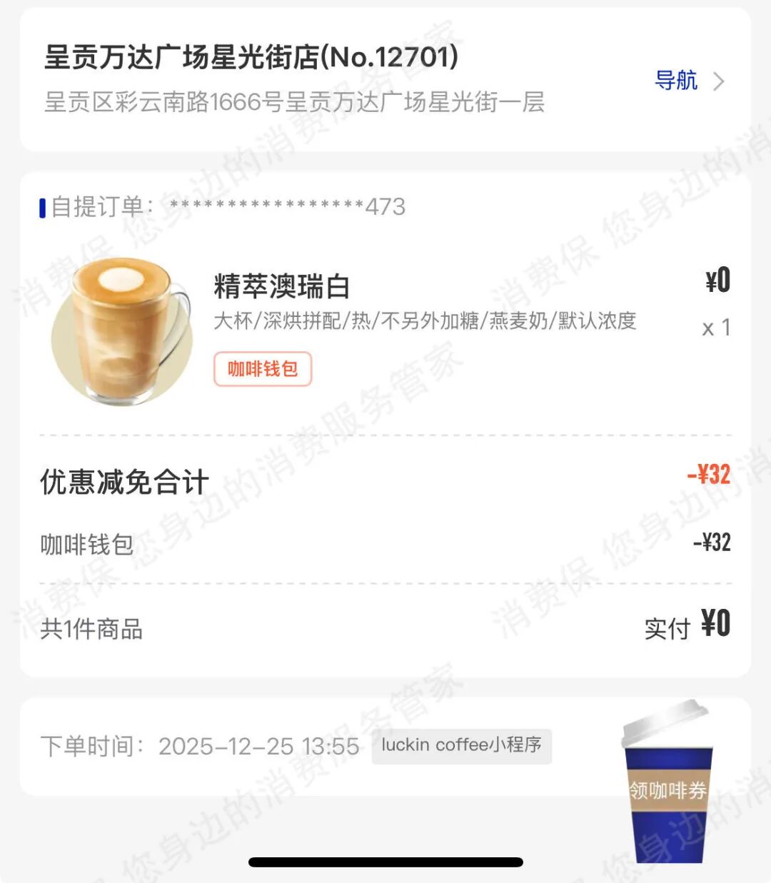 2025年12月25日,云南的齐先生在消费保平台投诉称,他在瑞幸(呈贡万达星光店)购买精粹澳白拿铁,因乳糖不耐受特意选择燕麦奶,并在取货时反复确认。