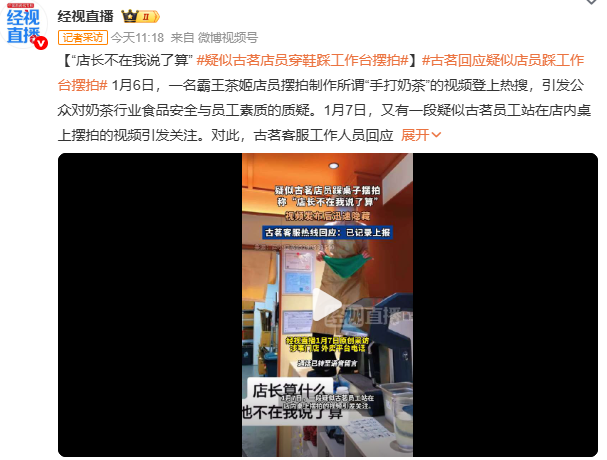 古茗:紧随其后,1月7日,疑似古茗员工穿鞋踩上工作台摆拍,配文"店长不在我说了算",甚至留言挑衅:"踩过厕所的鞋沾你奶茶上也可以"。
