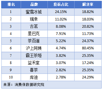 据统计,2025年咖啡奶茶行业投诉中,蜜雪冰城以24.15%的占比位居首位;瑞幸紧随其后,投诉占比为11.02%;古茗以8.08%的占比排第三。霸王茶姬排名第七,投诉量占比3.82%。