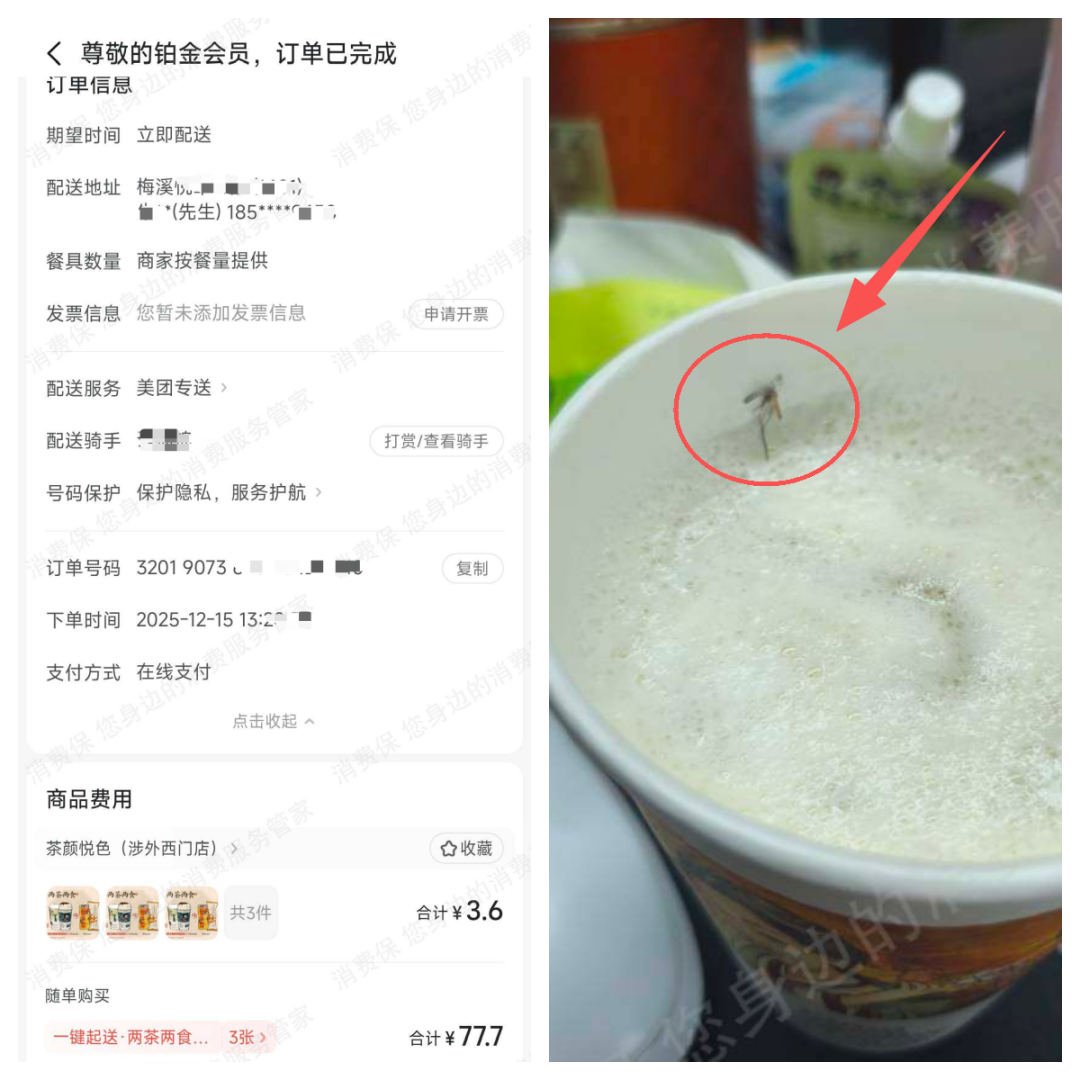 从品牌投诉看,茶颜悦色虽未入投诉量前十,但食品安全风险已现端倪。2025年12月,消费者朱先生在美团茶颜悦色(长沙涉外西门店)购买6杯幽兰拿铁,其中一杯幽兰拿铁开盖发现蚊子。此类事件虽属个案,却暴露出其现制饮品在卫生管控上的脆弱性。