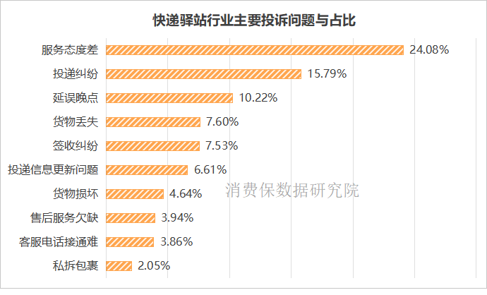 快递驿站相关投诉的主要投诉问题集中在服务态度差、投递纠纷、延误晚点、货物丢失等方面。其中,服务态度差问题占比为24.08%,占比近四分之一,是快递驿站行业最为突出的痛点问题。