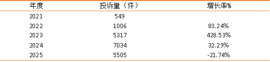 从数据中可以看到,与2022相比,2023年投诉量出现大幅攀升,增至5317件,同比增幅达428.53%。投诉量增长态势在2025年发生转折,开始回落,降至5505件,同比下降21.74%。这一转折与2025年大量快递驿站关停,行业存量收缩的现象有所对应。
