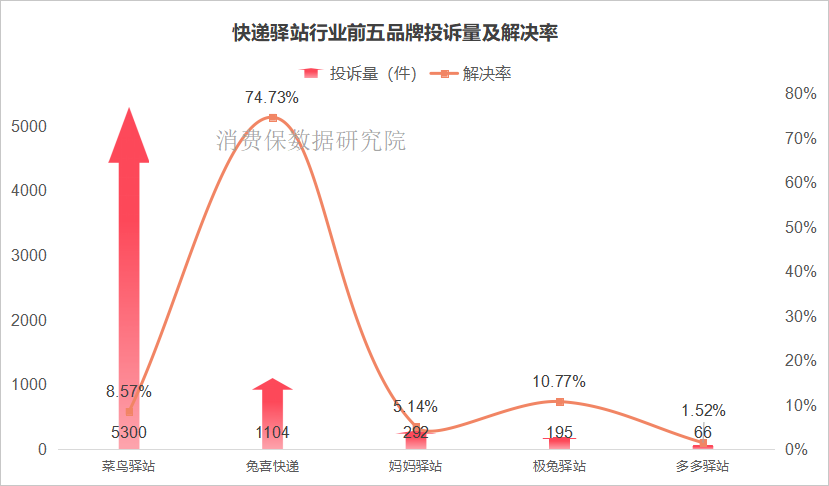 从主要快递驿站品牌投诉量看,菜鸟驿站以5300件位居榜首,远高于其他品牌,但其投诉解决率仅8.57%;兔喜快递投诉量1104件居第二,投诉解决率74.73%,在前五品牌中解决率最高。